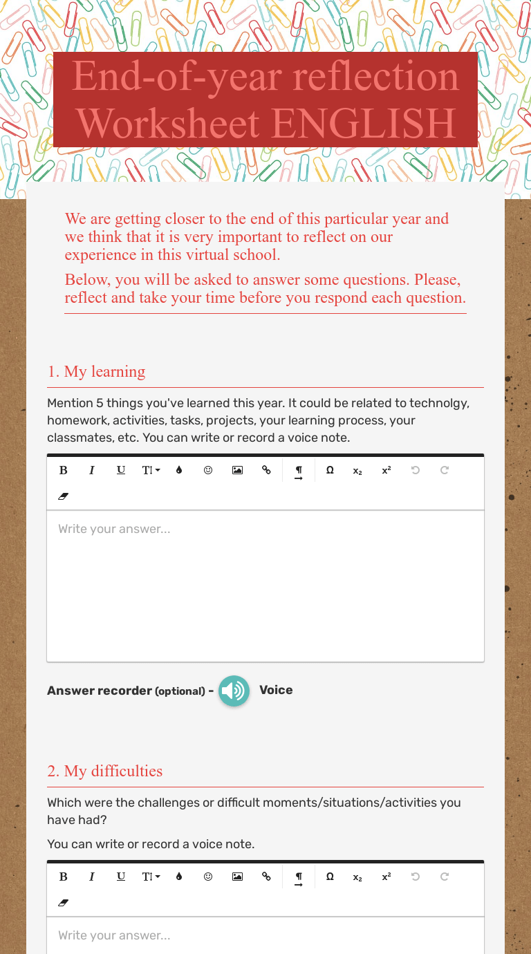 Together, you and your students will celebrate just how much you have overcome! Journal prompts, an end of year reflection worksheet, and end of year . A year to access thousands of ks1 and ks2 resources. You can do the exercises online or download the . Once you have your worksheet downloaded, find a quiet place and time to work on filling it .